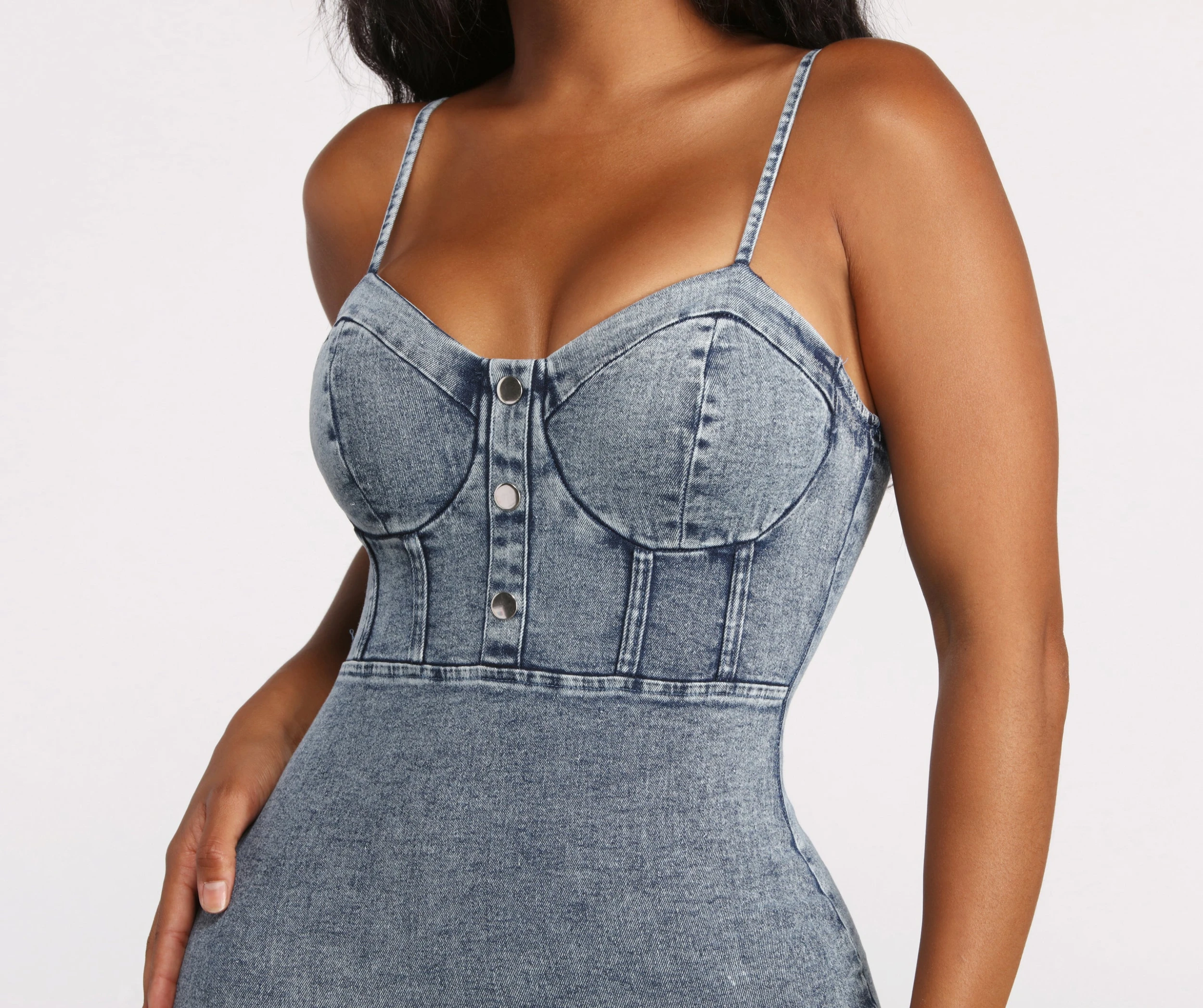 with bae. Fitted with a sleeveless sweetheart neckline, adjustable spaghetti straps to avoid wardrobe malfunctions, and corset-like seams that accentuate curves. The real details can be found in the multi-button down accent at the bodice that leads to a