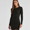Bring on the style with this trendy basic knit midi! The dress features a mock neckline, long fitted sleeves, and a mid-length, curve hugging fit. Garment is composed of a brushed knit fabric with a knit lining, offering plenty of stretch.