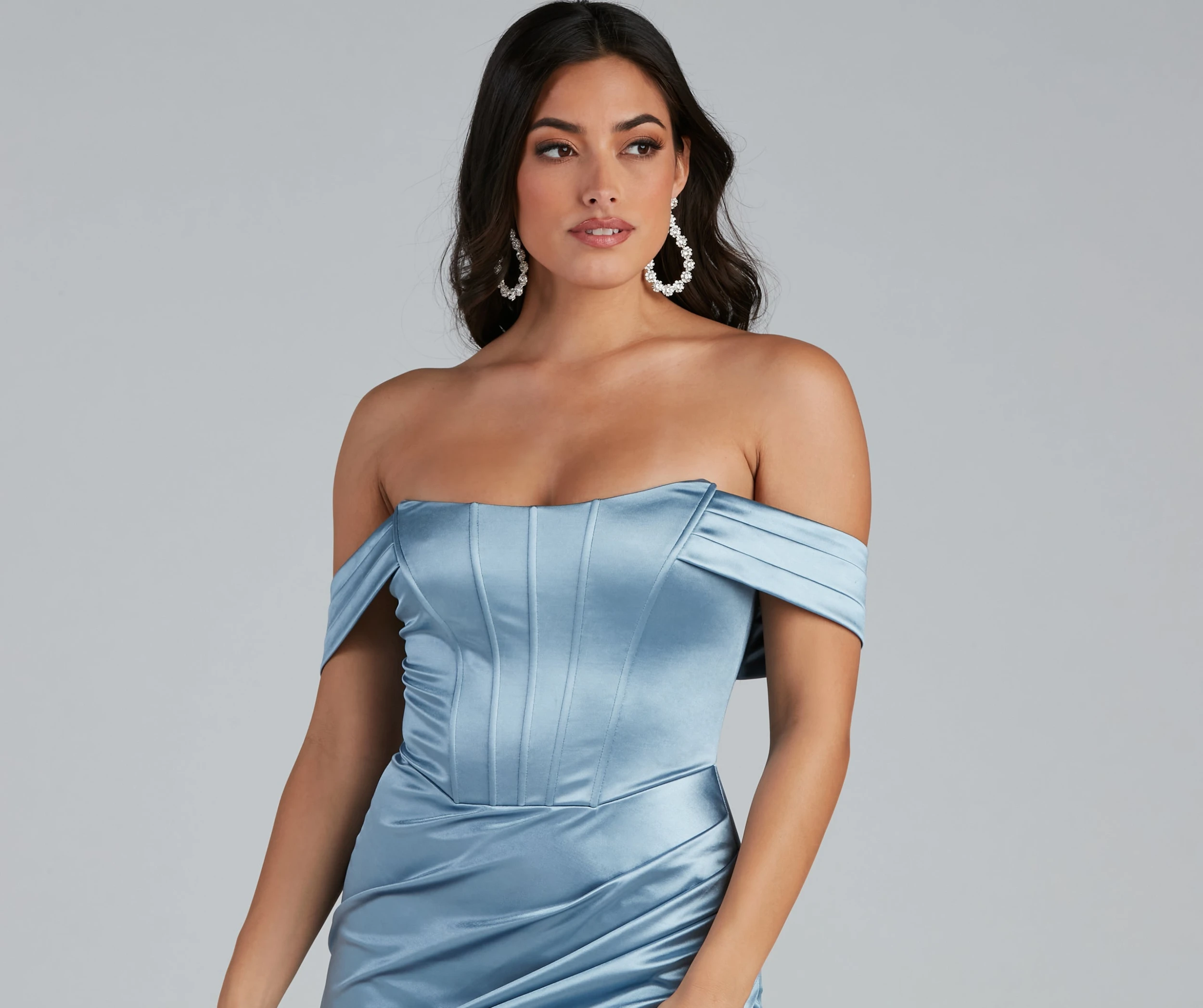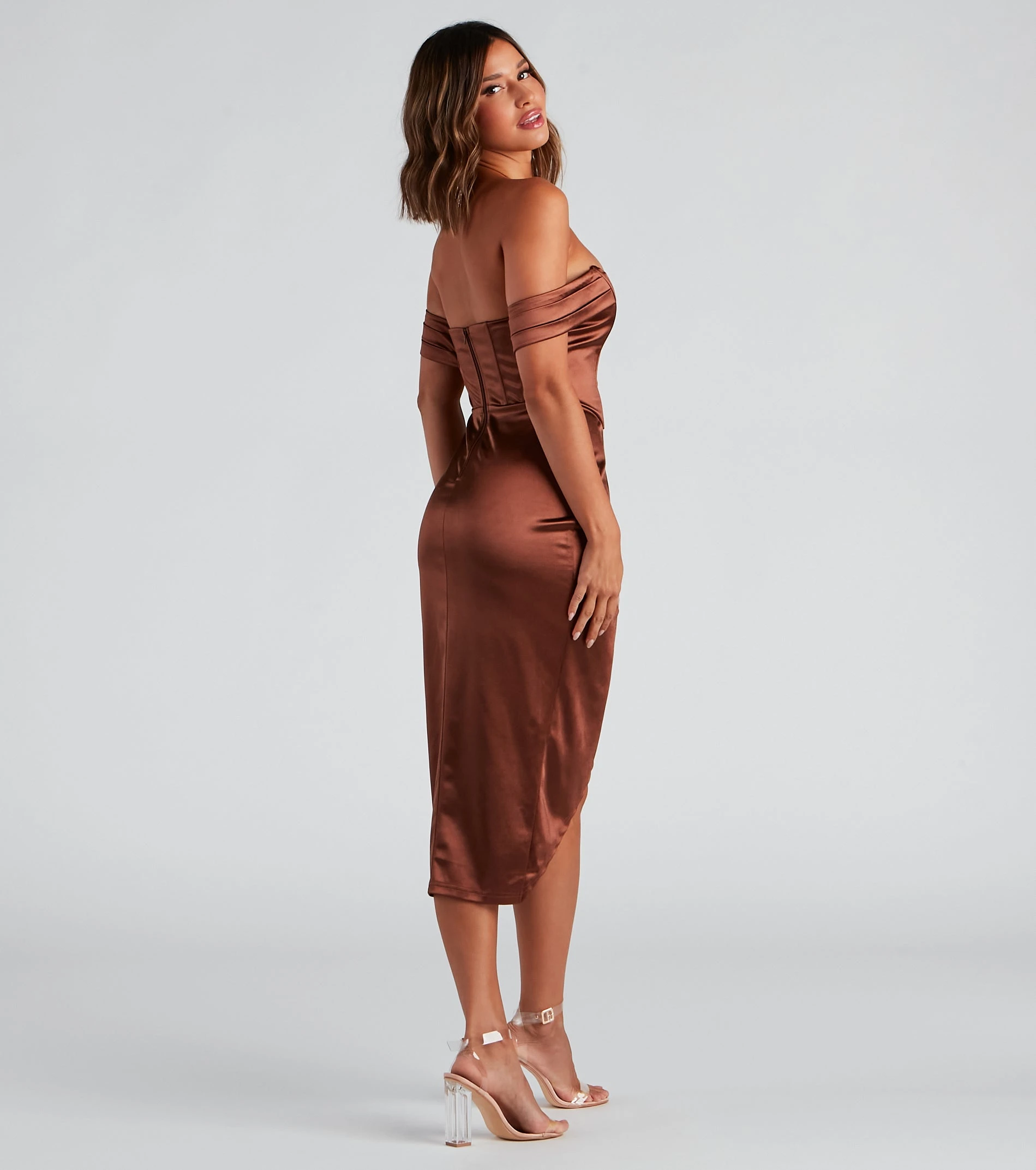 Leave the room breathless in the sweet Coraline formal dress at your next fancy affair! She stuns in an off-the-shoulder neckline with pleated sleeve cuffs and a sultry corset bodice with flexible boning. Her empire waist effortlessly shapes the wrap midi skirt designed to give you a curvy look. The dress is composed of silky smooth satin fabric with minimal stretch. Complete your look in a glam