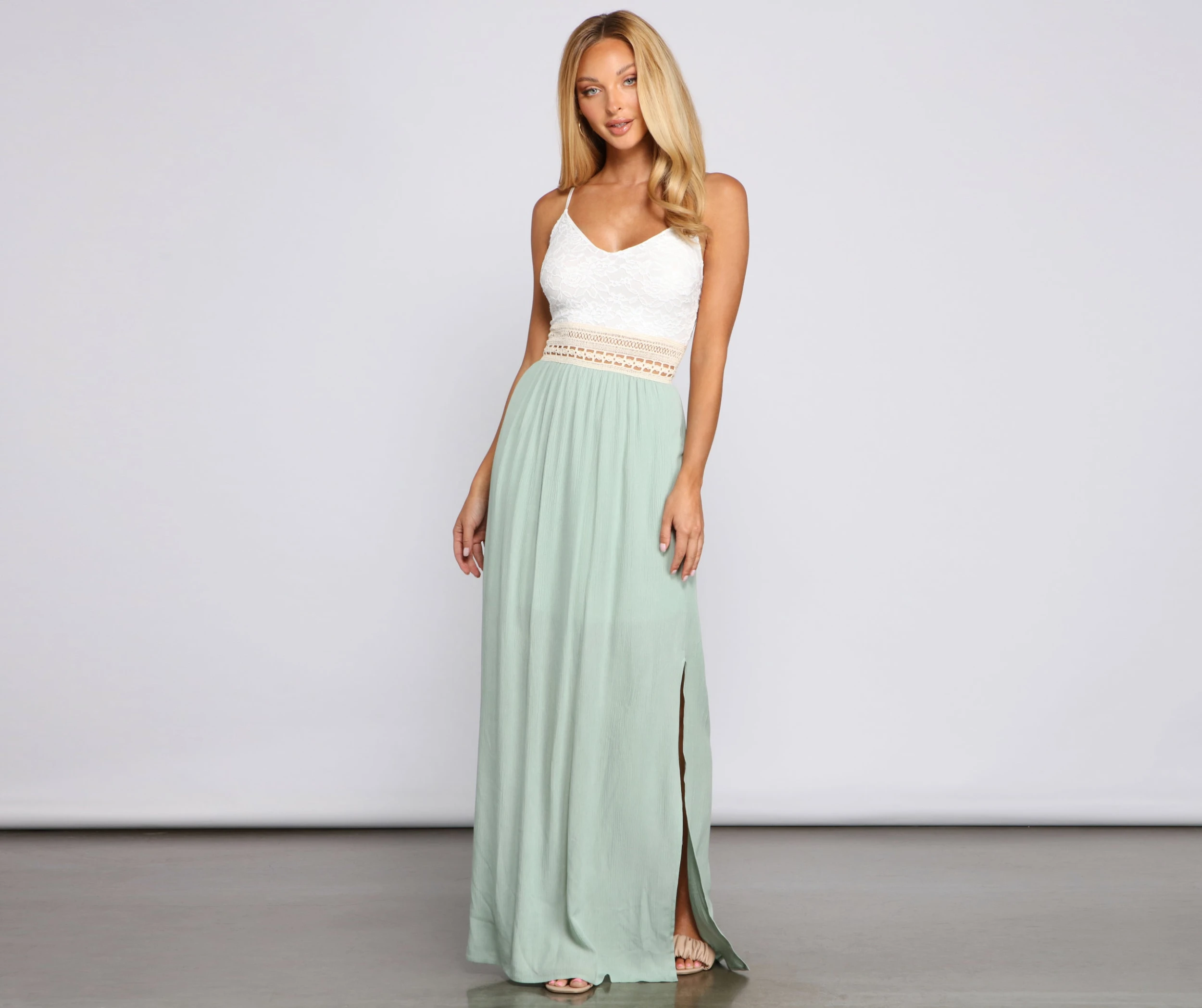 You’ll look effortlessly stunning in this flowy maxi dress that is perfect for the warmer months. It features spaghetti straps that lead to a cross-back design, a lace top with a V neckline, a sheer crochet high waist, and a flowy floor-length gauze skirt with a side slit. Complete the look with on-trend