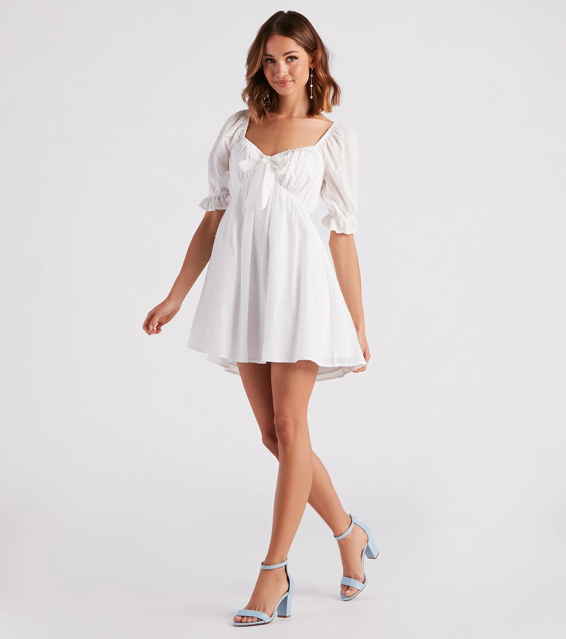 You’ll be in for the romantic vibes of this short skater dress perfect for bridal showers or day dates! It features three-quarter-length puff sleeves, a sweetheart neck, a tie-front, and a fit and flare silhouette. The dress is composed of a swiss dot pattern cotton fabric with a smooth woven lining. Complete the look in simple