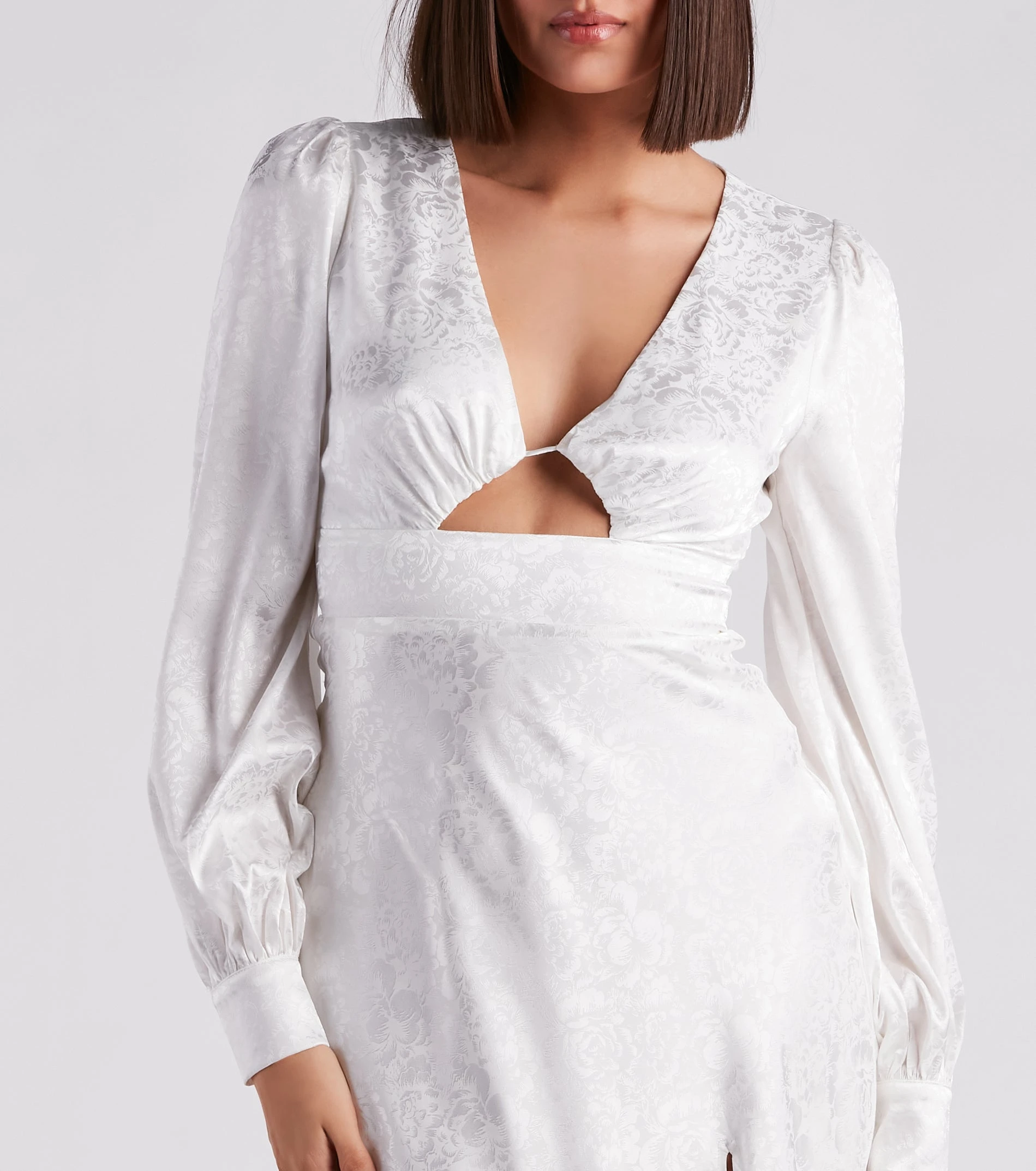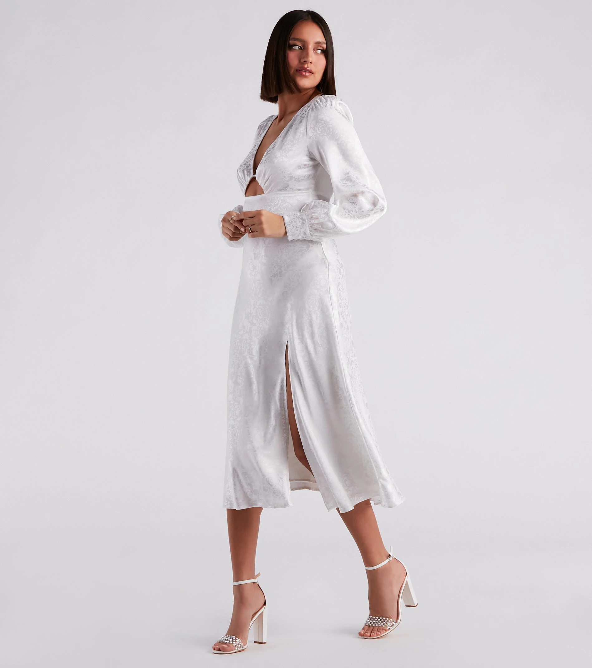 Worthy of walks down the aisle for bridesmaids and hallways entering the reception! The Kacy formal dress features long bishop sleeves with button cuffs, a V-neckline, a bar and cutout accent along the bust, and a flowy silhouette with a midi-length hem and slit. The formal dress is composed of jacquard satin fabric with lining and no stretch. Style with sparkly