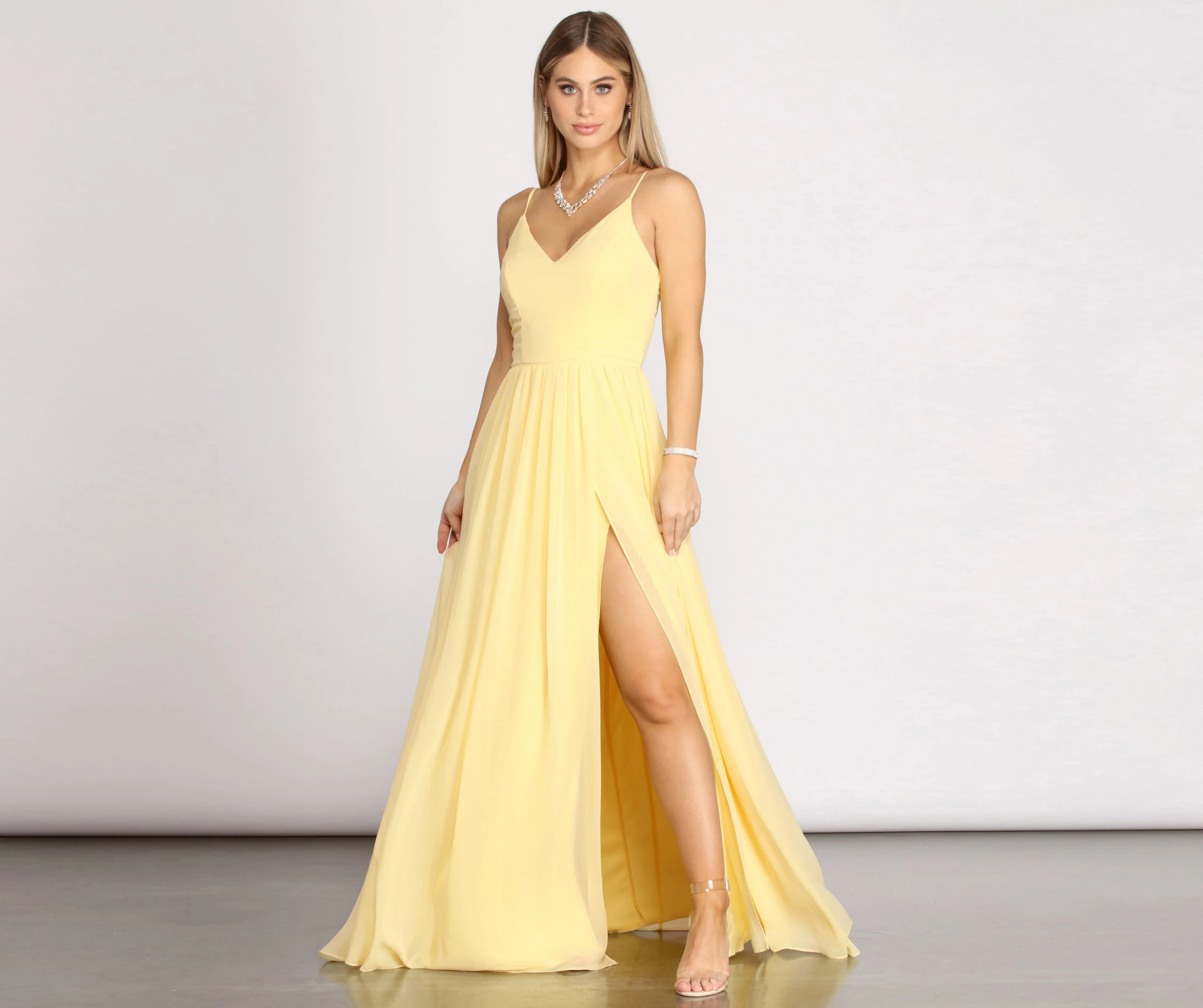 Bring the glamour in the ever so lovely Polly dress! She features a vibrant yellow hue, a sleeveless bodice, a plunging V neckline, padded cups, princess seams and adjustable narrow straps. Her slim fit bodice leads to an elongating sweeping floor length A-Line skirt that is accented with a high side slit to show off your heel game! She offers a form hugging fit with minimal stretch.