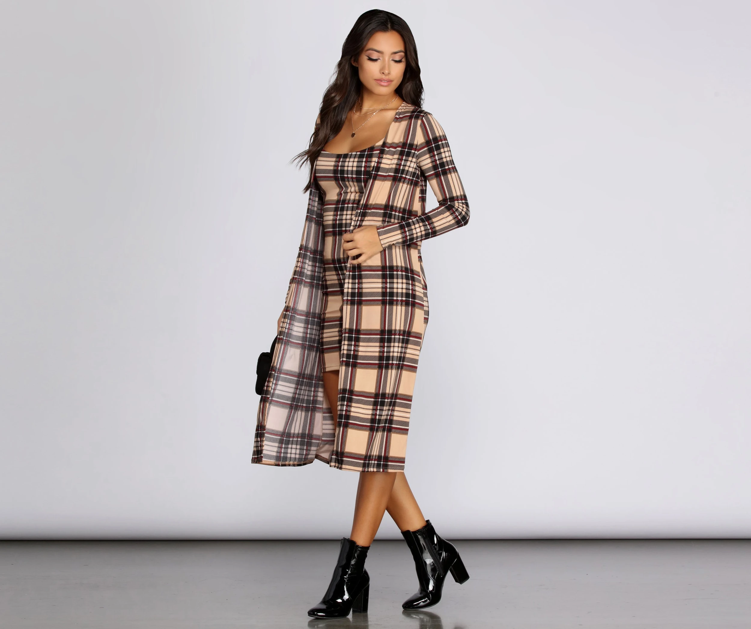 Be the it girl of your squad in this pretty and posh mini! The dress features a sleeveless bodice, a rounded neckline, a square back, and a short, form hugging fit. The dress is composed of a stretchy knit fabric with a full knit lining and showcases a trendy all over plaid print.