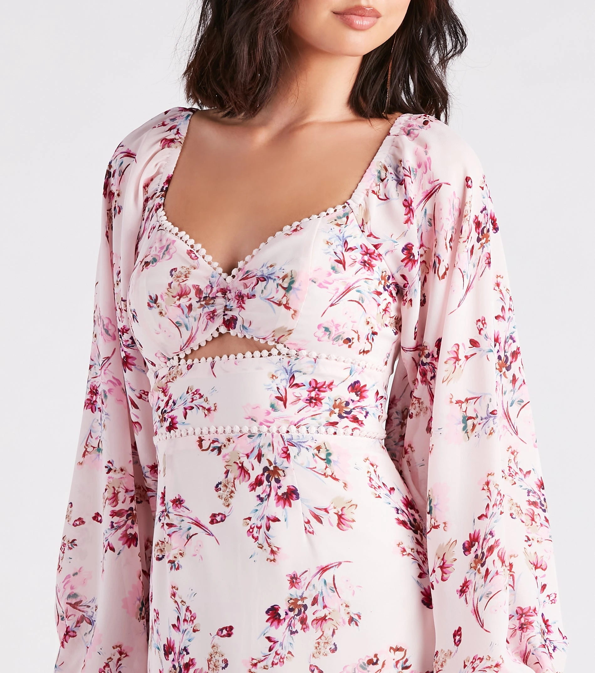 Get ready for this floral chiffon dress to make its way into your summer wardrobe! It features flowy peasant long sleeves, a sweetheart neck with trim, a tie-back design, a cutout accent along the bust with trim, and a curve-hugging silhouette with a flirty ruffled short-length hem. Complete the look in