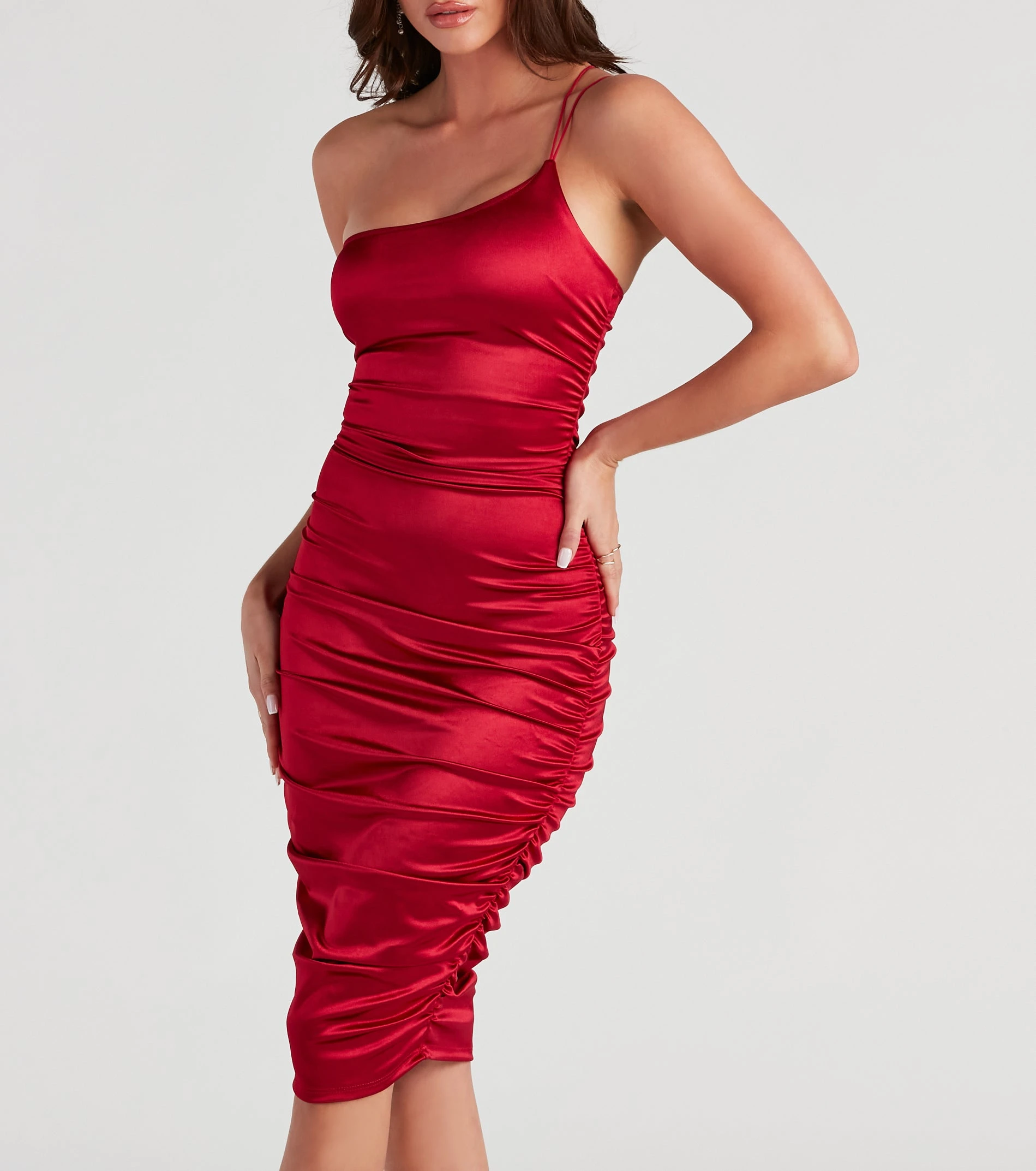 You’ll be ready to stylishly strut in this sleek satin midi dress! It features a sleeveless one-shoulder neckline with dual spaghetti straps, ruching down the sides, and a mid-length, curve-hugging fit. The satin-knit fabric offers a moderate stretch. Complete your party look with gold hoops and