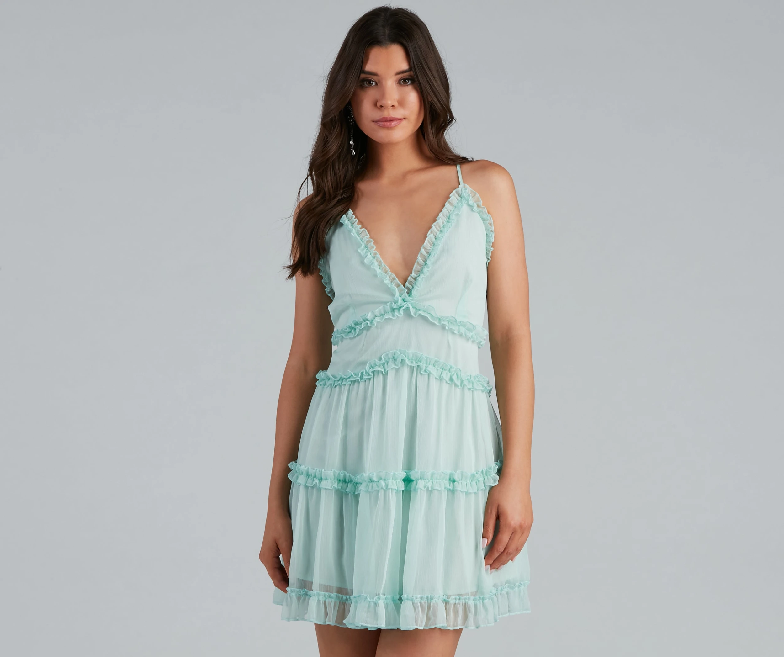 Make a ruffle at the party in this chiffon babydoll dress featuring a sleeveless V-neckline, adjustable spaghetti straps, criss-cross back, flowy silhouette, and a ruffled trim throughout. Composed of a chiffon woven fabric with an inner skirt lining. Perfect for styling with a mini