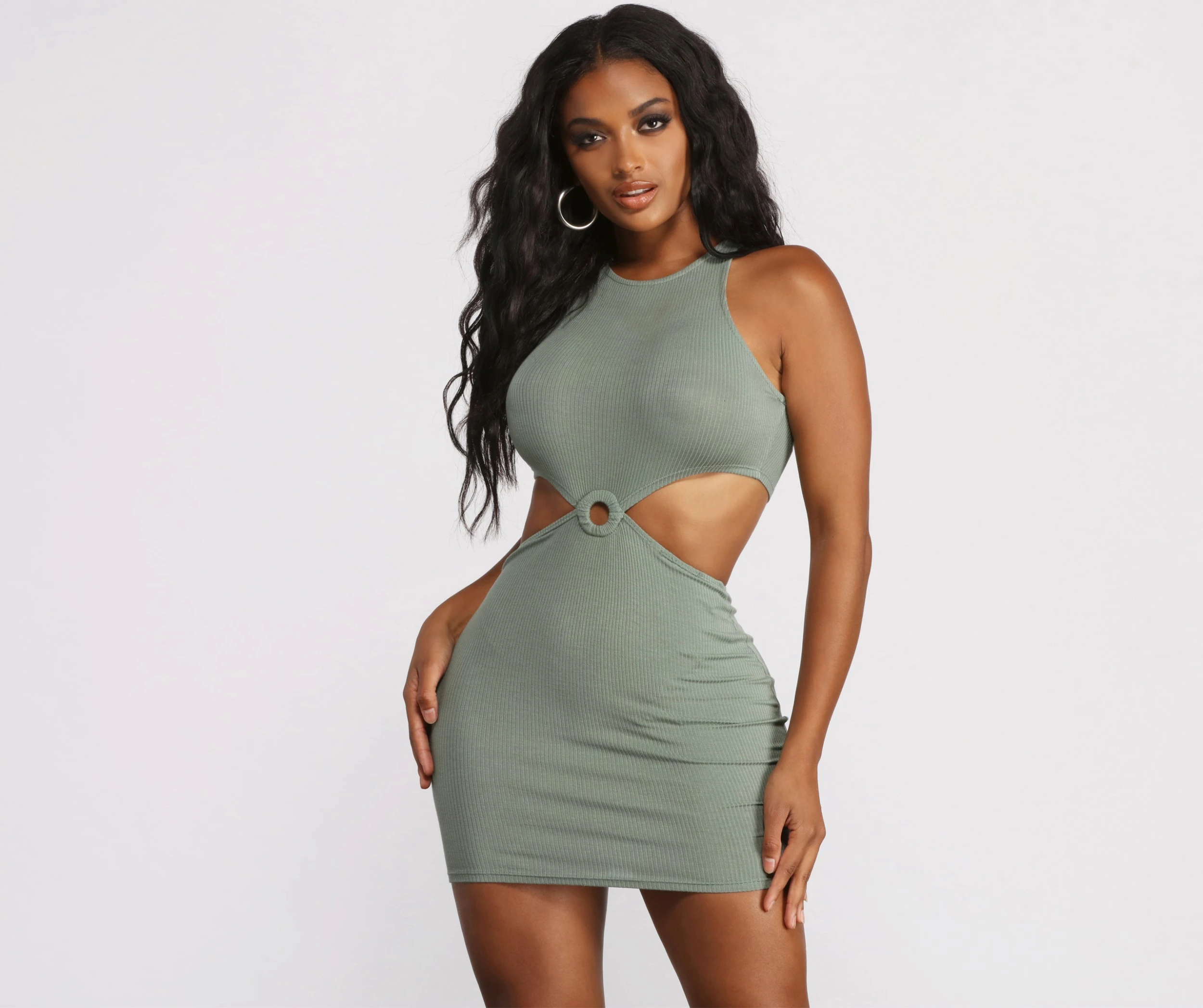 with sexy cutout details this season. The curve-hugging ribbed dress features a flattering crew neck that leads to a chic O-Ring at the mid-drift accented with waist cut outs for a subtle hint of skin. The back reveals a matching lower back cut out to impress from all angles. The ribbed knit embraces curves while offering a moderate stretch to easily move. Complete this