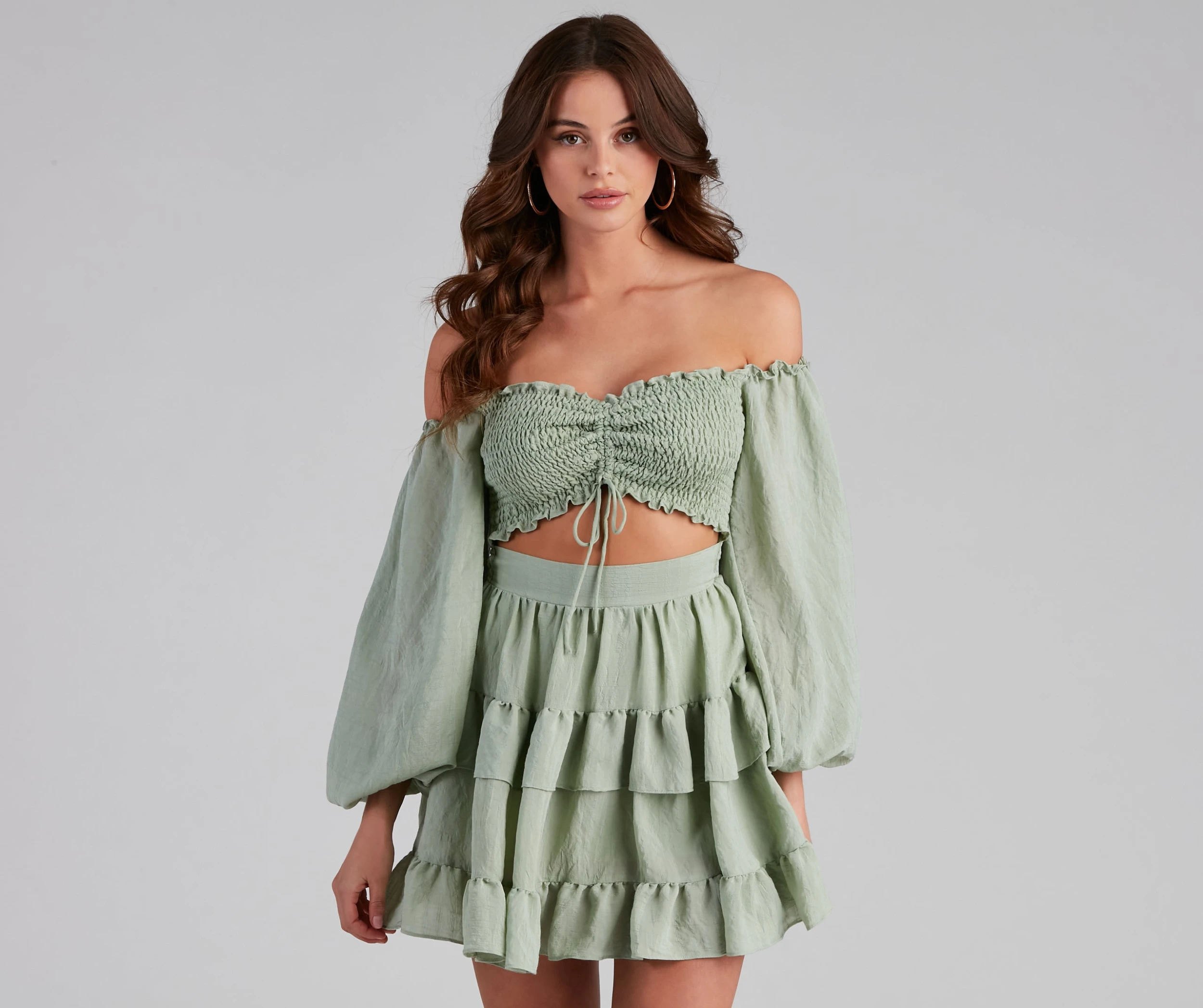 Keep it so sweet with a charming ruffled skater dress! The dress features an off-the-shoulder neckline, a smocked bodice with a ruched drawstring, long sleeves, a sexy cutout at the midriff, and a tiered ruffled skater silhouette. The dress is composed of a lightweight gauze knit fabric that offers a relaxed fit with minimal stretch. Complete look with