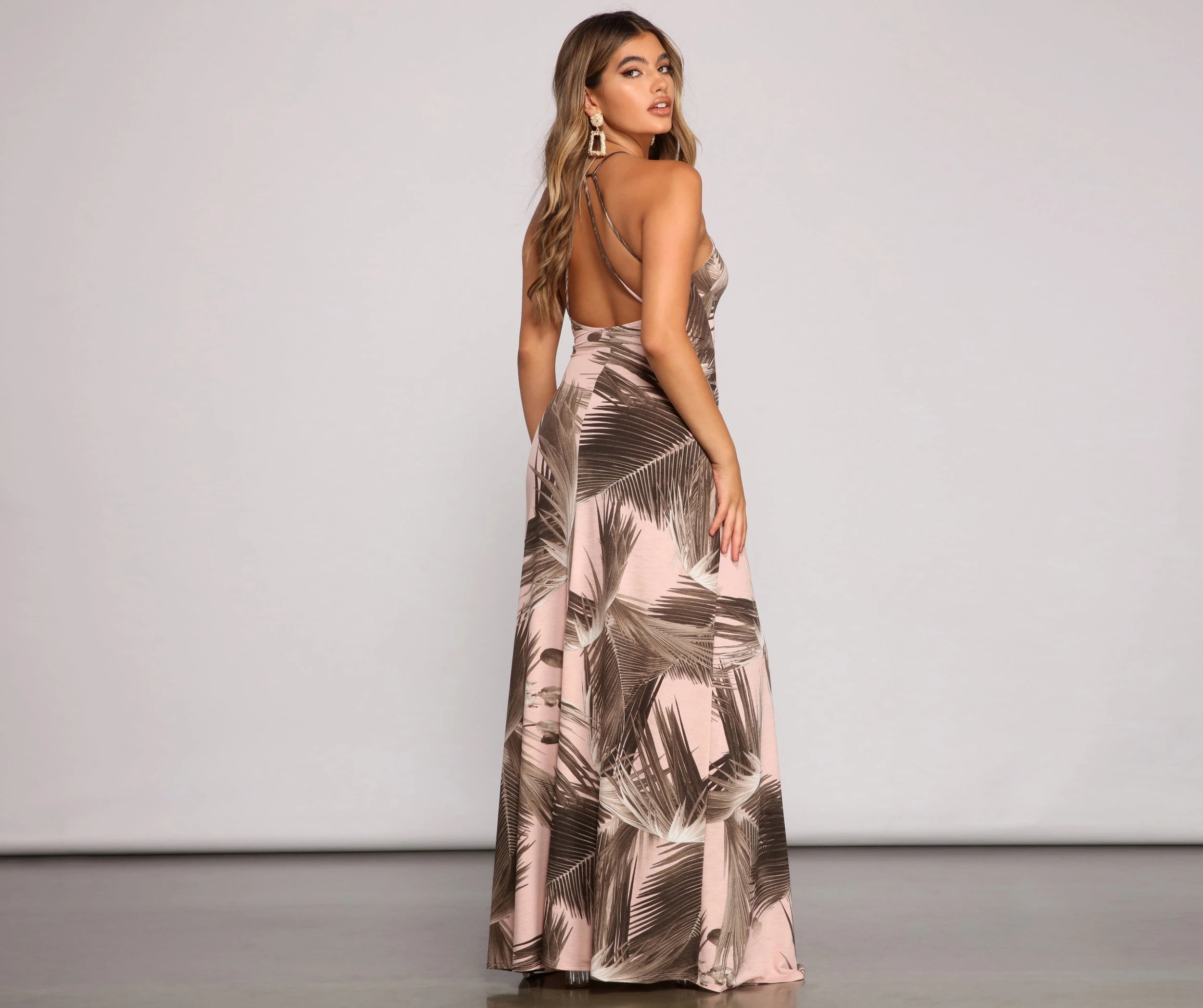 Showcase your stunning beauty in this tropical maxi dress on your next weekend getaway! It features a sleeveless V neckline, spaghetti straps that lead to an open back with a strappy design, a high waist, and a floor-length hem with a relaxed fit. The knit fabric has an all-over palm leaf print to bring the vacay vibes. Complete the look with