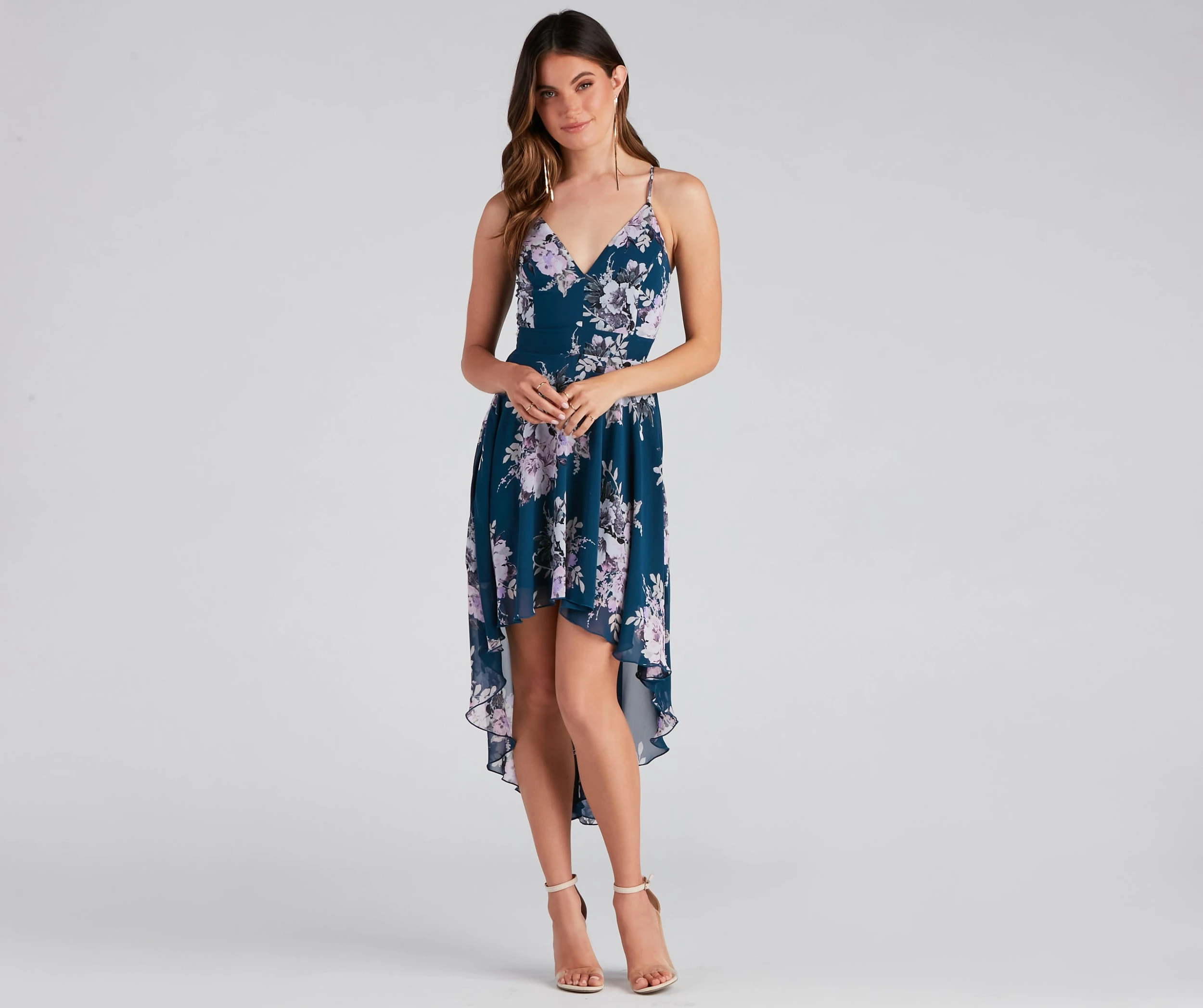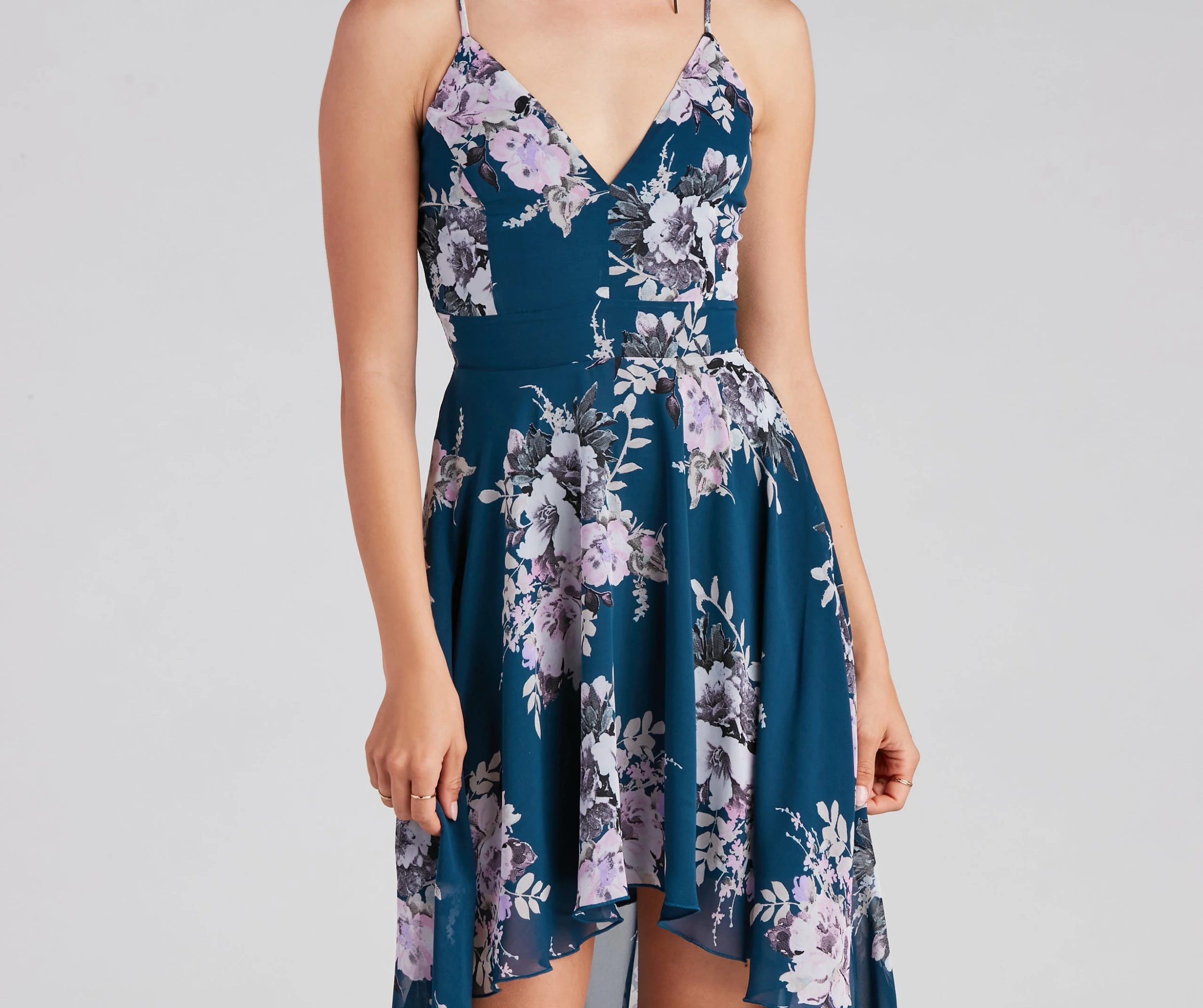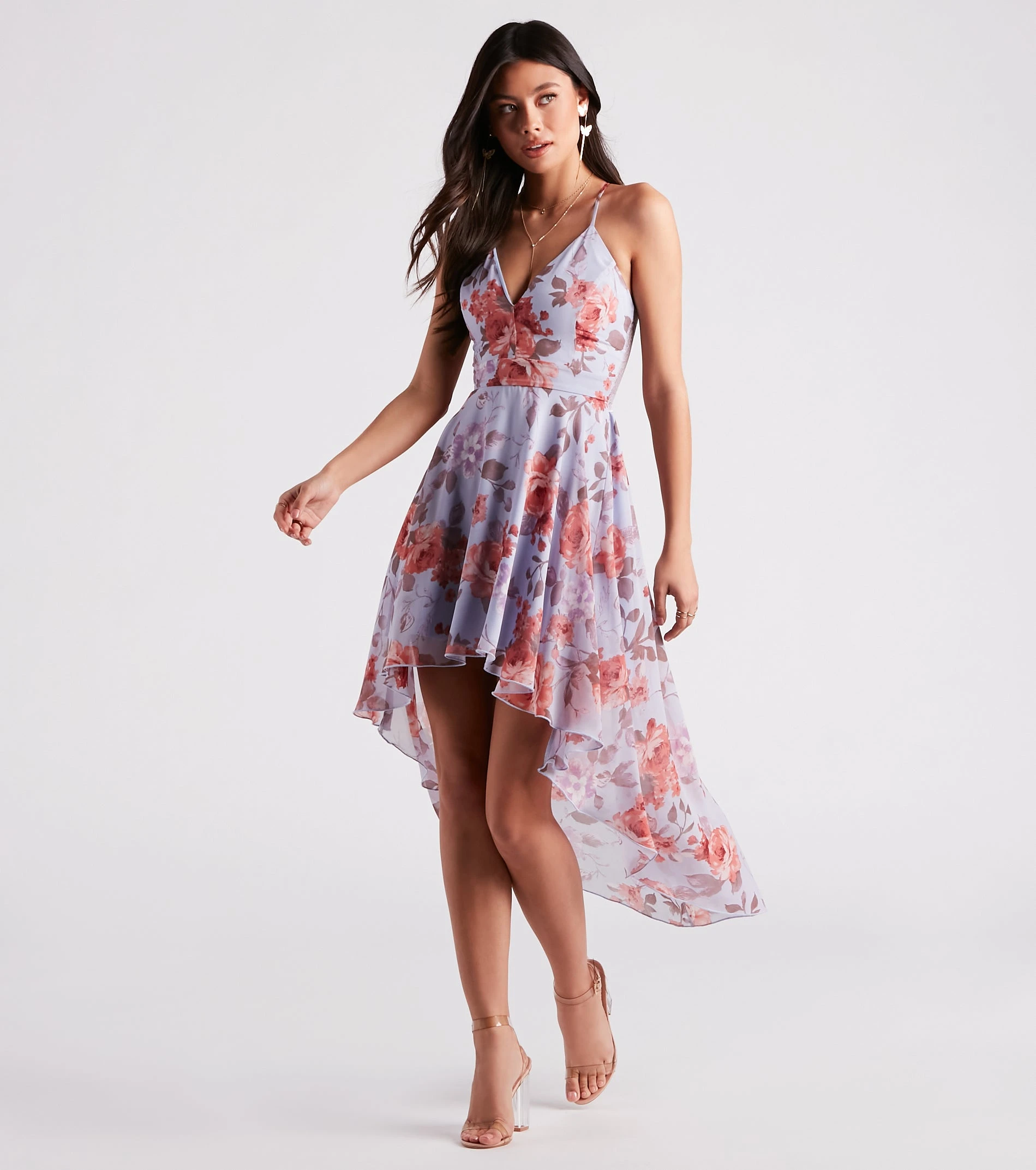 Sugar and spice and everything nice! Look so sweet in this floral chiffon dress featuring a sleeveless V-neck, spaghetti straps, and an open back with lace detail on a flowy, high-low hem. Complete the look in statement