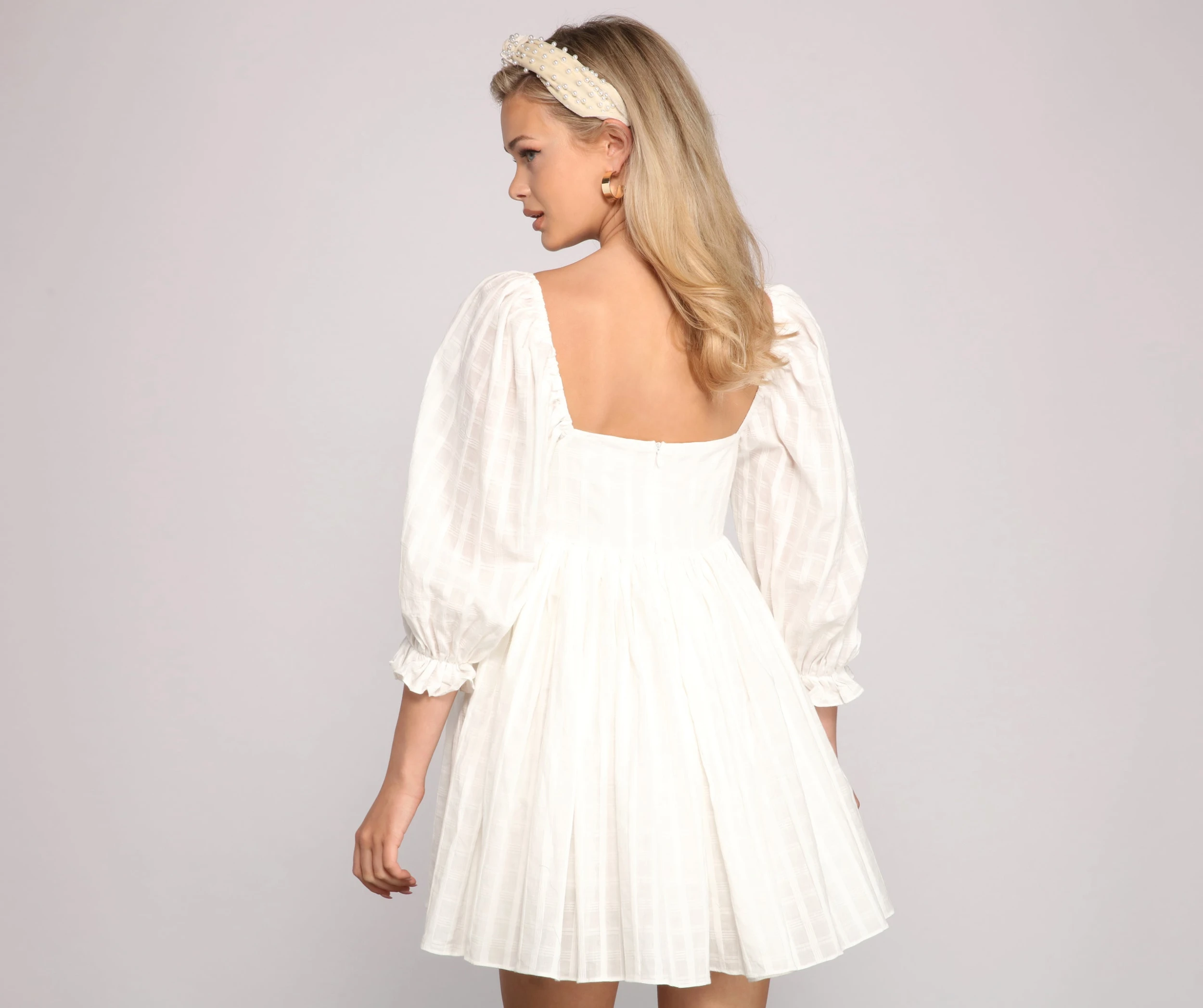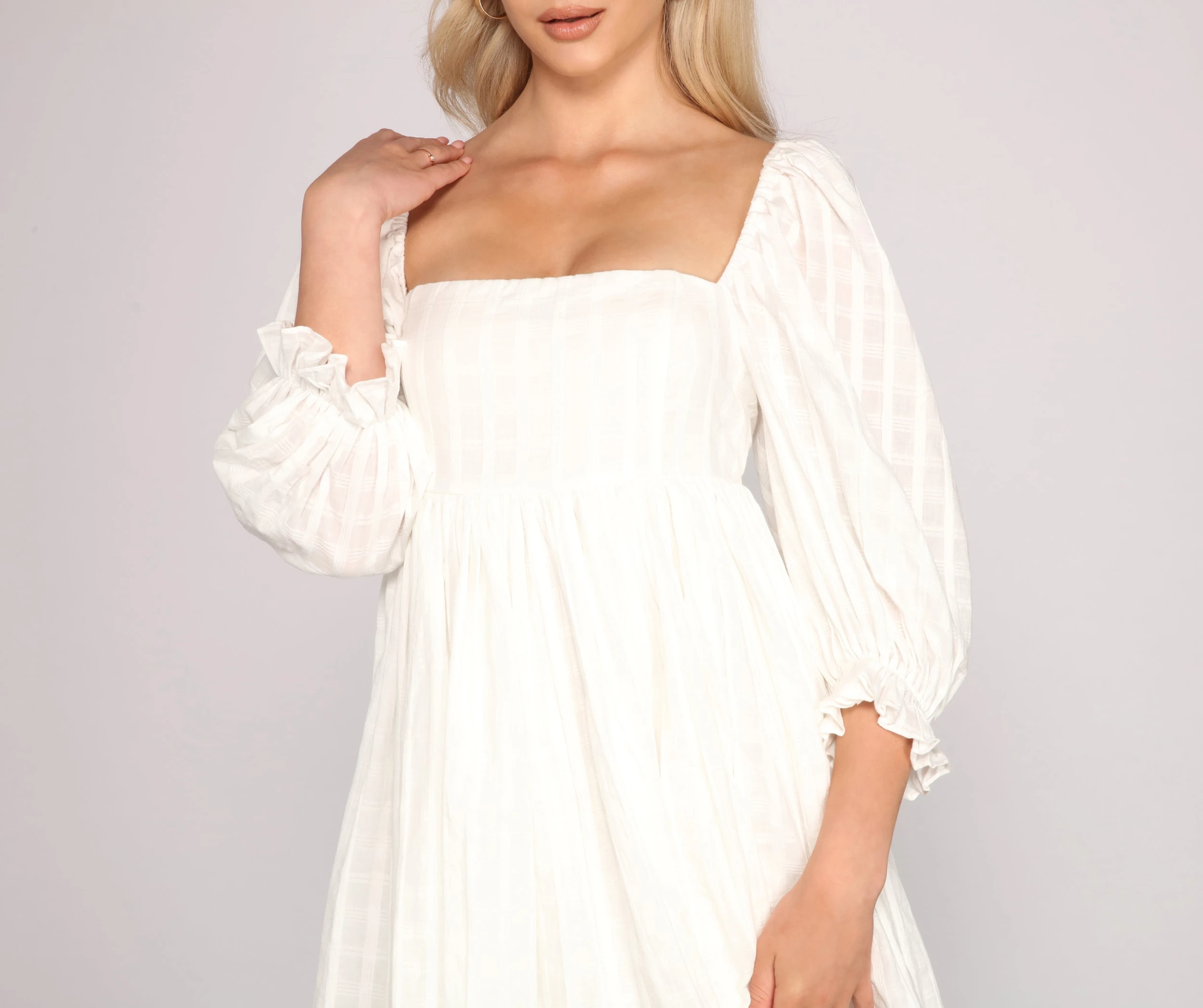 Showcase a sweet style this season in this adorable babydoll dress. It features a square neckline, three-quarter length puff sleeves with ruffled cinched hems, a high waist seam under the bust, and a flowy short A-line silhouette. Pair this dress with dainty earrings and